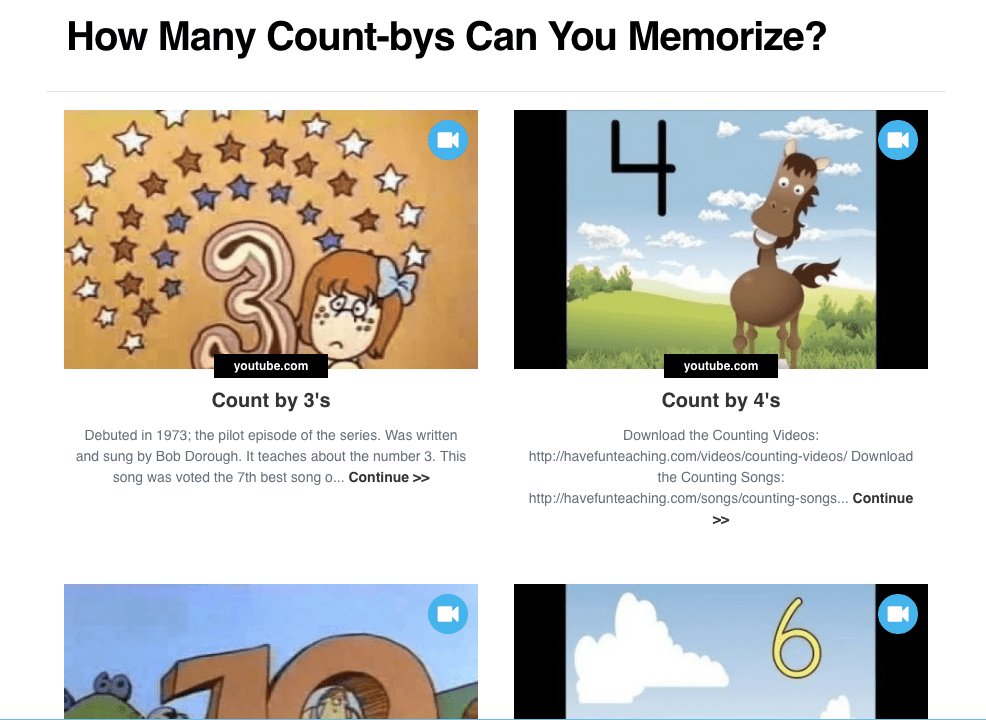 All of students’ favorite videos for learning their multiples. Before this e-link, I would just show the different videos one by one, starting with the 3’s in my grade. What was surprising was that many students are now taking the initiative to learn them all on their own at home, just because I set up an easy page for them to use.