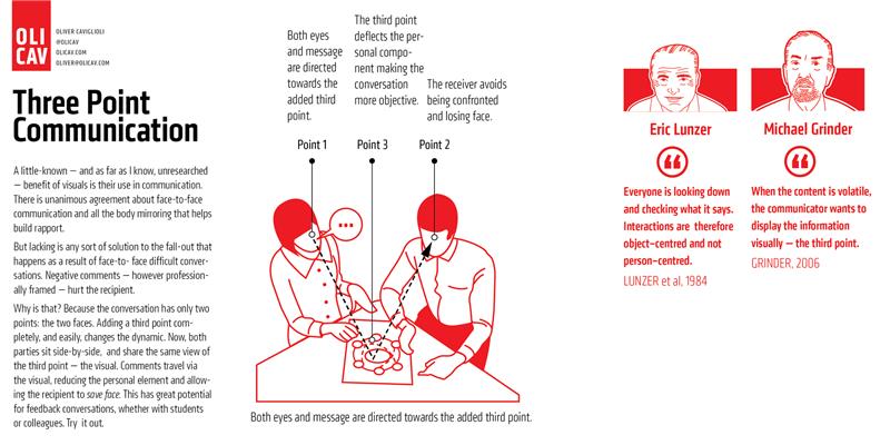 This week I led a reading group session at my school on the article, “Have Technology and Multitasking Rewired How Students Learn?” by Daniel Willingham (here). Having led a lot of these, I’m convinced that reading groups are a more effective and enjoyable form of professional learning than ones that do not focus on a text. One reason why this is may be related to the concept of “Three Point Communication,” as shown in the infographic below. As teaching is so closely tied to identity, it can feel confrontational to talk directly about one’s teaching. Using an aid (like a research article) changes the dynamic: