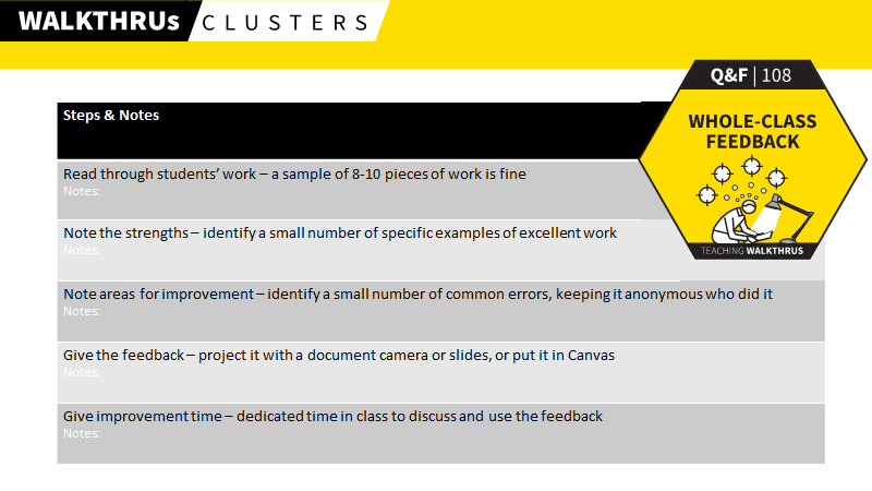 Just as each of the 5 step guides in WalkThrus 1 & 2 varies in complexity, they vary in concreteness and specificity. One of the reasons that a book like Teach Like a Champion seems to resonate with so many teachers is that it tells you exactly what to do to enact its moves. It’s a breath of fresh air for teachers who are fed up with the vague and nebulous advice (e.g. “Relationships matter”; “There’s no one best way to teach”; “One size doesn’t fit all”; “Don’t teach content, teach them how to think”; etc.. ) that plagues this profession. Some of the WalkThrus in the “How” section of each book, such as the Whole Class Feedback example above, are refreshingly specific, but general enough to be applicable across all age levels and subjects.