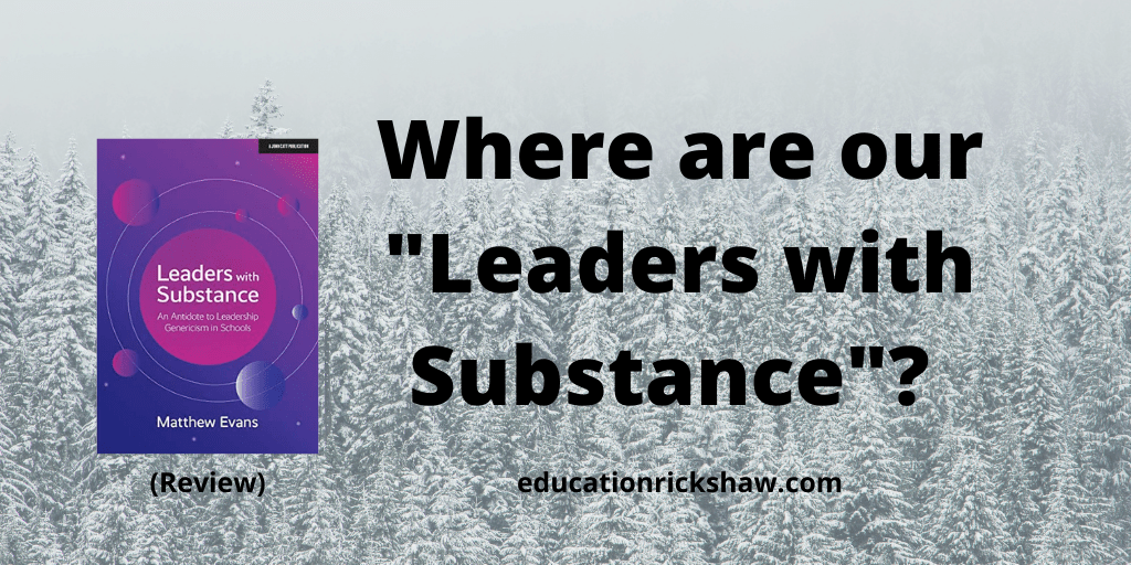 Evans’s book, Leaders with Substance: An Anecdote to Leadership Genericism in Schools, continues in this vein, hitting hard against our misguided faith in hollow leadership and advocating for leadership with substance. Chapter after chapter he argues that the best school leaders tend to know a whole lot of stuff that only applies to schools. He doesn’t go so far as to suggest that a successful ski resort manager would be a hopeless school manager; There are clearly skills (e.g., how to balance a budget, conduct interviews, organize large numbers of people, etc.) that would transfer between the two contexts; but he shares my belief that schools would be better off with more leaders who possess a well-developed schema of knowledge on, say, learning theory, instructional strategies, and teacher professional development.