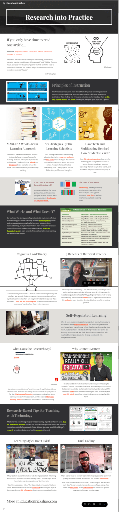 Fortunately, there are a lot of teacher-friendly resources out there, including open-source articles, podcasts, infographics, and even YouTube videos, that help bridge the research-practice gap. I recently put together a webpage full of these sorts of resources for my colleagues. Some of the topics include cognitive load theory, learning styles, dual coding, self-regulated learning, retrieval practice, study skills, and much more. Feel free to check it out and spread it around: