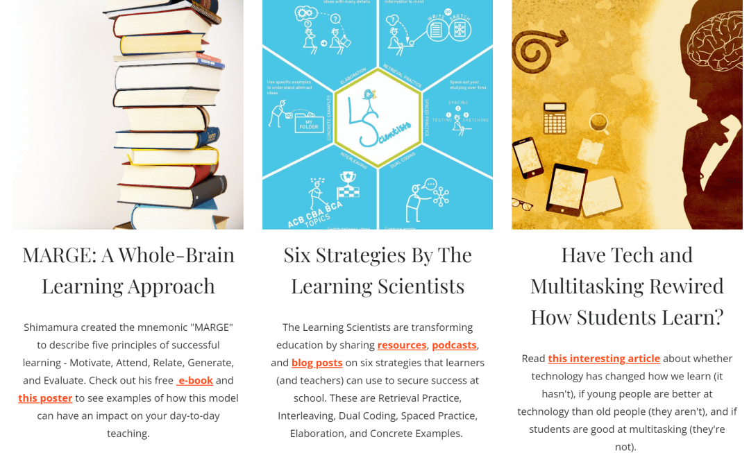 Fortunately, there are a lot of teacher-friendly resources out there, including open-source articles, podcasts, infographics, and even YouTube videos, that help bridge the research-practice gap. I recently put together a webpage full of these sorts of resources for my colleagues. Some of the topics include cognitive load theory, learning styles, dual coding, self-regulated learning, retrieval practice, study skills, and much more. Feel free to check it out and spread it around: