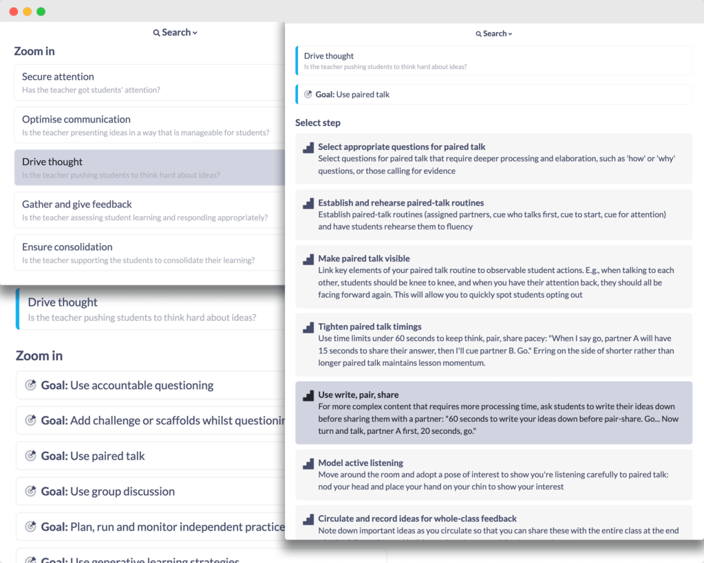 Steplab gets its name because it contains thousands of Action Steps and accompanying study modules based on research-informed teaching techniques. These are organized into five strands based on Mary Kennedy’s work on the persistent challenges teachers face and mapped against Dan Willingham’s memory model of how learning works. Action Steps provide the “What” of coaching, much like a curriculum for coaches!