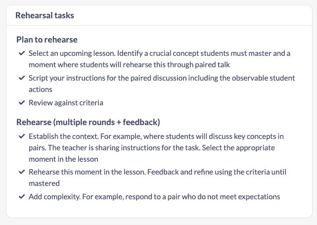 During the episode, we talk about “rehearsal tasks”, which are simply practice opportunities that a coach or presenter can plan for teachers. During the podcast, I bring you some examples of rehearsal tasks that are built into a PD platform called Steplab: